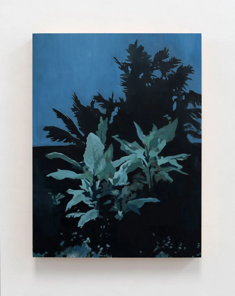 What emerges in Nightglow is both regional and metaphysical. The works are recognizably grounded in the outskirts of Alajuela, where the artist gathered inspiration during regular night walks. But these paintings do not illustrate reality, they interrogate it. Central to the series is an ecoGothic impulse: the rural landscape is not pristine, but technified, managed, and blurred with artificial interventions. Monocultures, altered soils, and production boundaries register in the night as both fertile and estranged, echoing the tensions of modern life where promise and threat, abundance and alienation coexist.