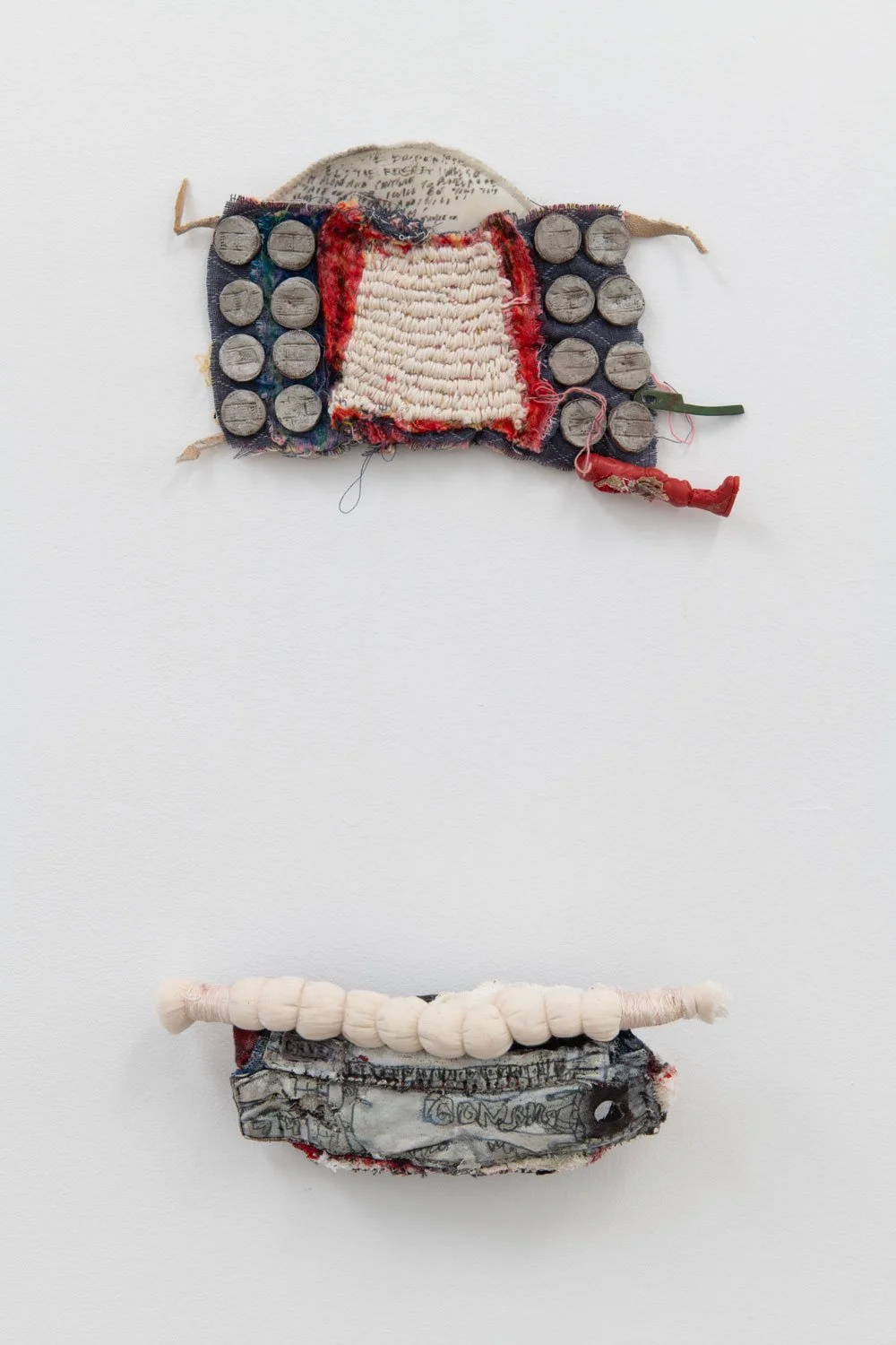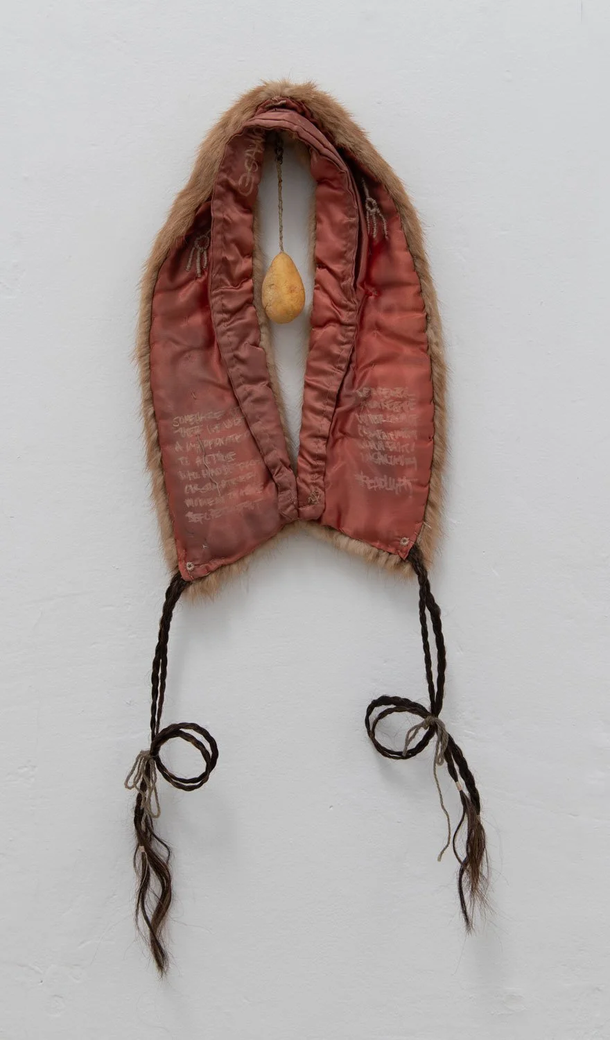 Lev Sibilla (b. 1999) is a multimedia artist and professional scavenger in Oregon who turns his found materials into three-dimensional diary entries, ornaments, and tableaus. The products of gradual collecting and sporadic building, his assemblage sculptures—made by hand-sculpting, sewing, and fusing found materials—serve as artifacts of the present moment, or encapsulations of fleeting feelings and worries. They are rife with contradiction, both trash and treasure, human and not. A fur stole is stitched with ribbons of synthetic hair, suggesting a grotesque vanity. A shoulder pad becomes a circus tent, entertainments dangling underneath.