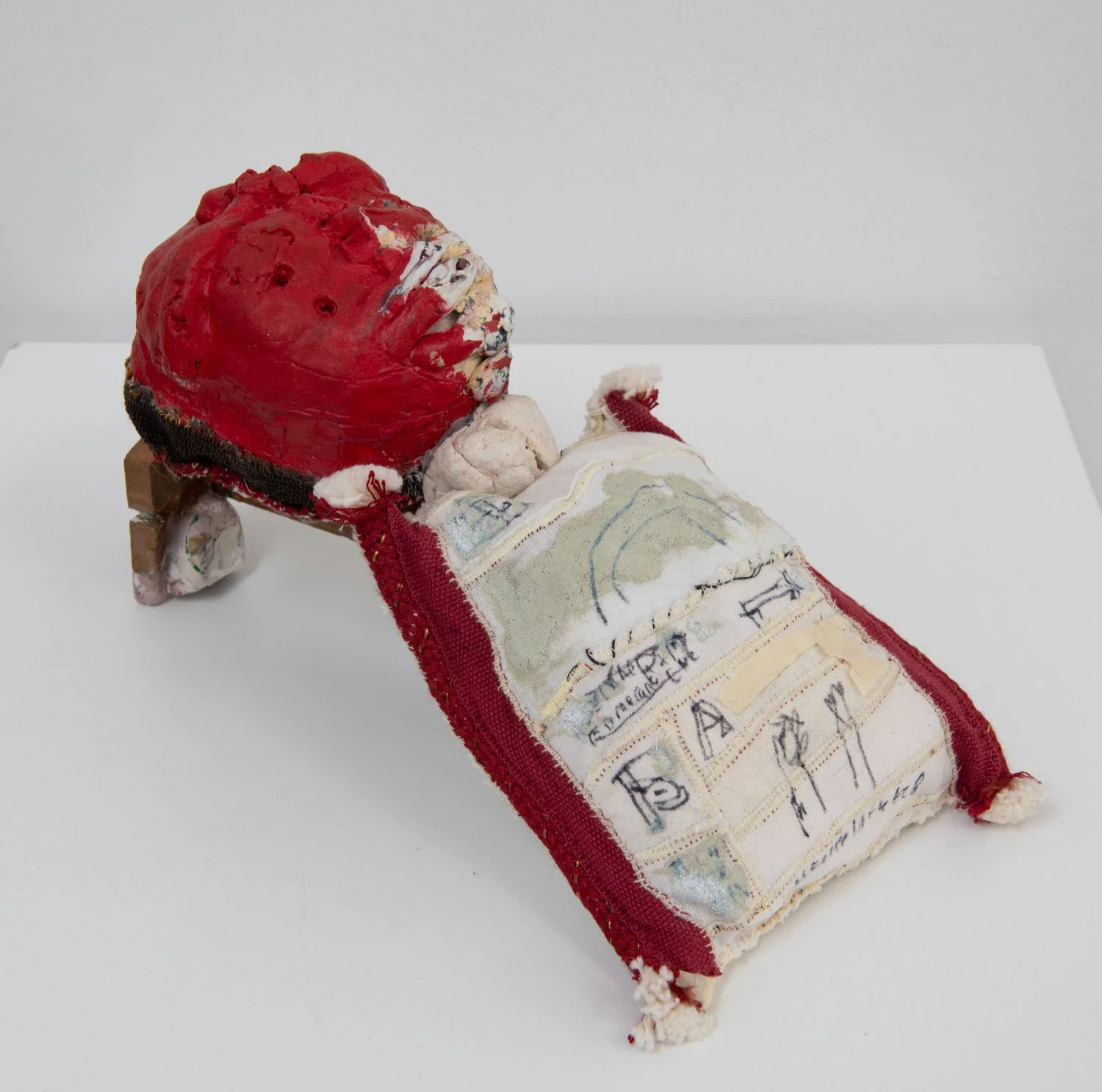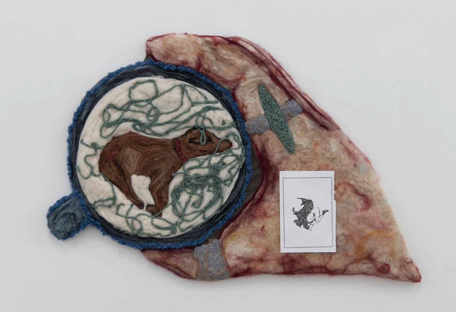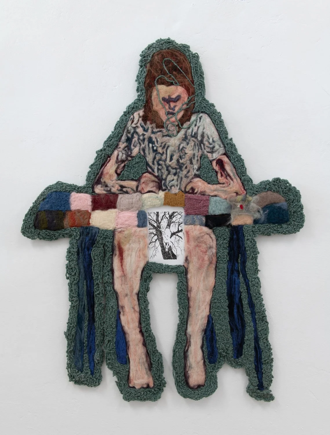 Ika Pearl (b. 2000) is a Las Vegas artist using texture, form, and gesture to create hand-felted wall pieces that encapsulate shifting emotional states and memory-mediated experiences. 2 for sorrow 3 for joy is an amalgamation of hyperspecific memories and feelings: in the same breath, Pearl recalls finding a dead hummingbird, getting bitten by a dog, long car rides and letter-writing. The very nature of this kind of associative logic is reflected in the swirling tufts of the material—the texture of the felt looks something like brain tissue, shaped by a myriad of experiences both good and bad. The image of two hands holding a dead and crumpled hummingbird forms a frame for this piece, and in the blank space between the wrists, there is a small drawing—perhaps the beginning of another story.