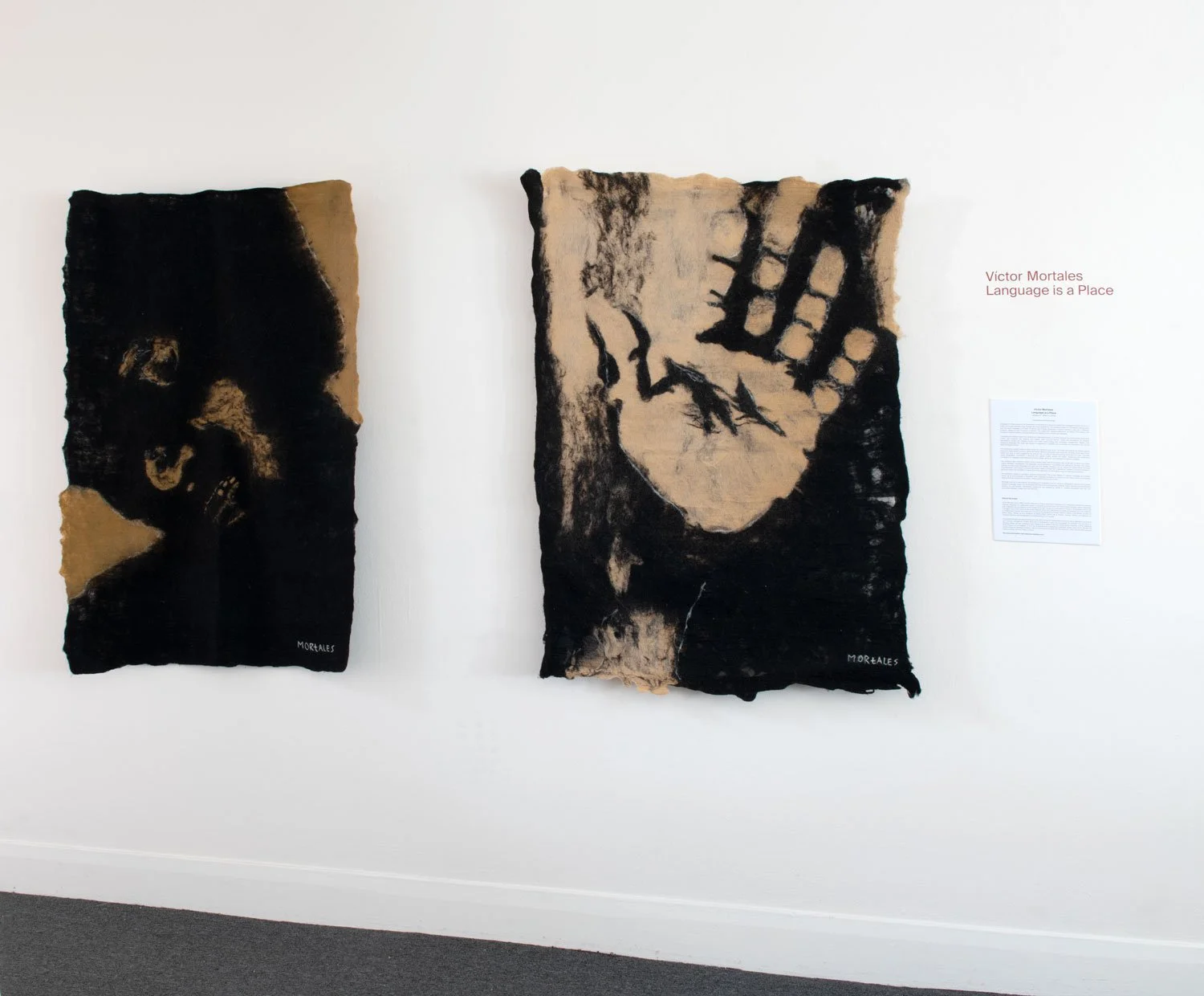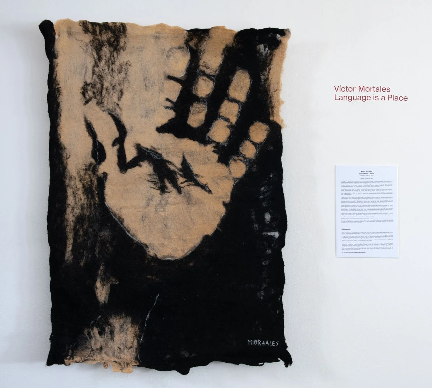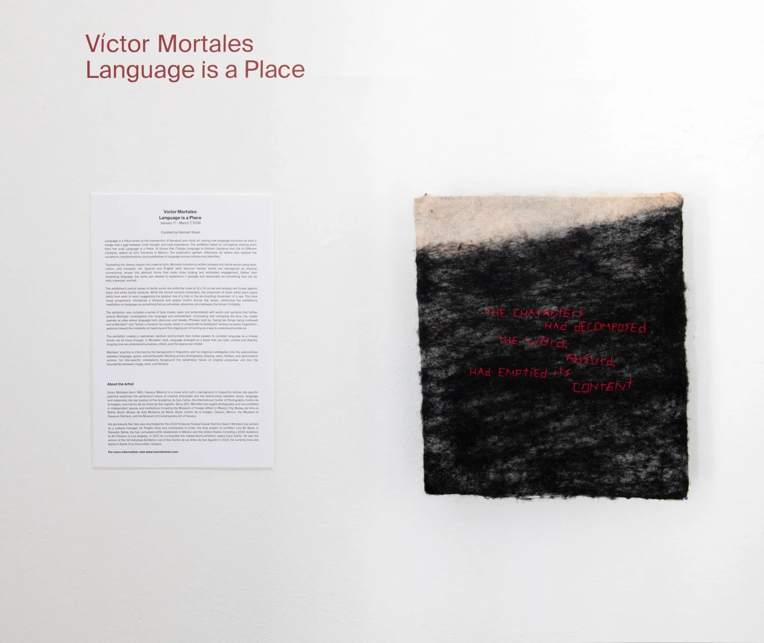 The exhibition creates a restrained, abstract environment that invites viewers to consider language as a shared terrain we all move through. In Mortales’ work, language emerges as a place that can both confine and liberate, shaping how we understand ourselves, others, and the spaces we inhabit.