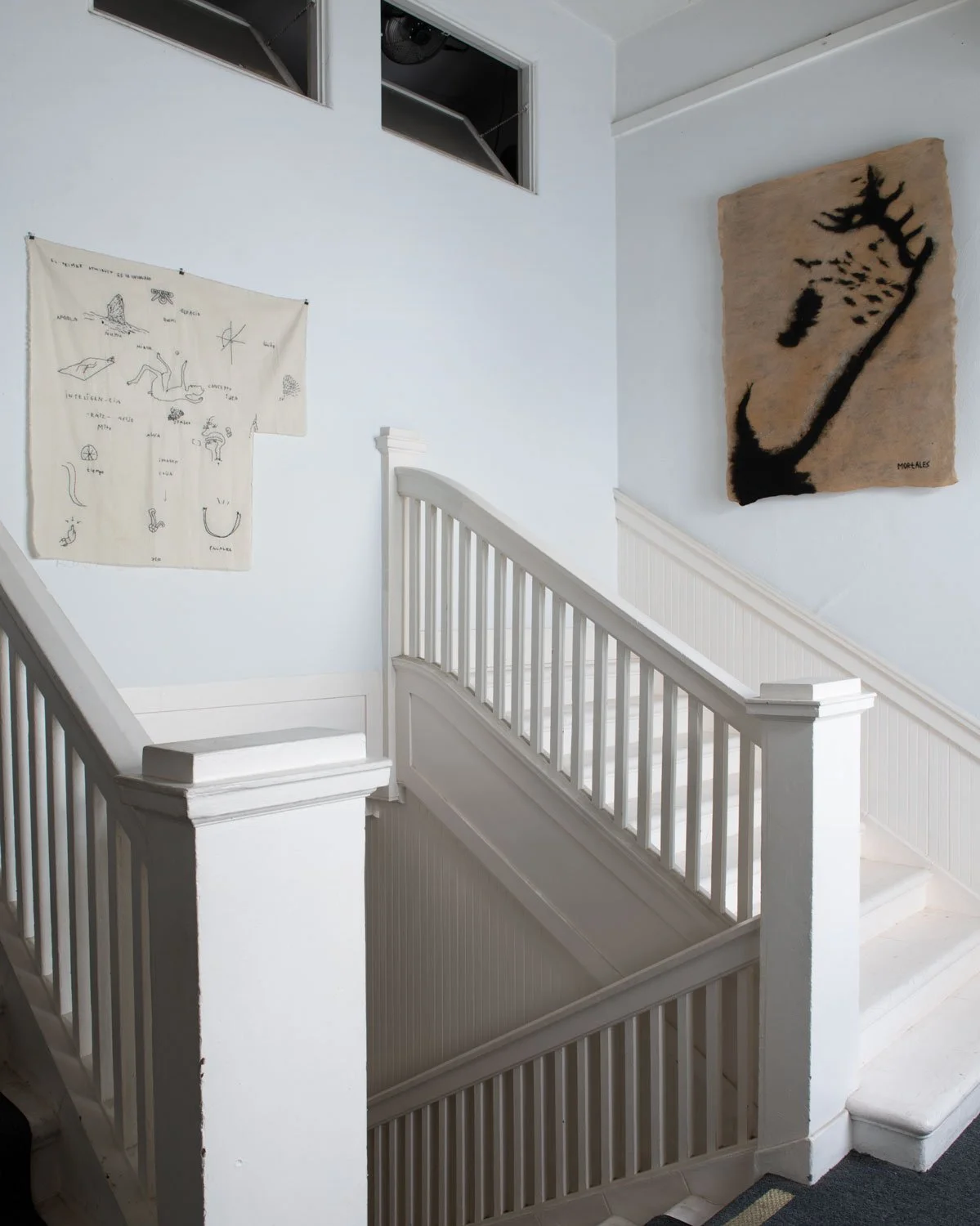 Translating this literary inquiry into material form, Mortales transforms written phrases into tactile works using wool, cotton, and mosquito net. Spanish and English texts become texture; words are reimagined as physical connections, woven into abstract forms that invite close looking and embodied engagement. Rather than illustrating language, the works ask viewers to experience it spatially and sensorially—as something that can be held, traversed, and felt.