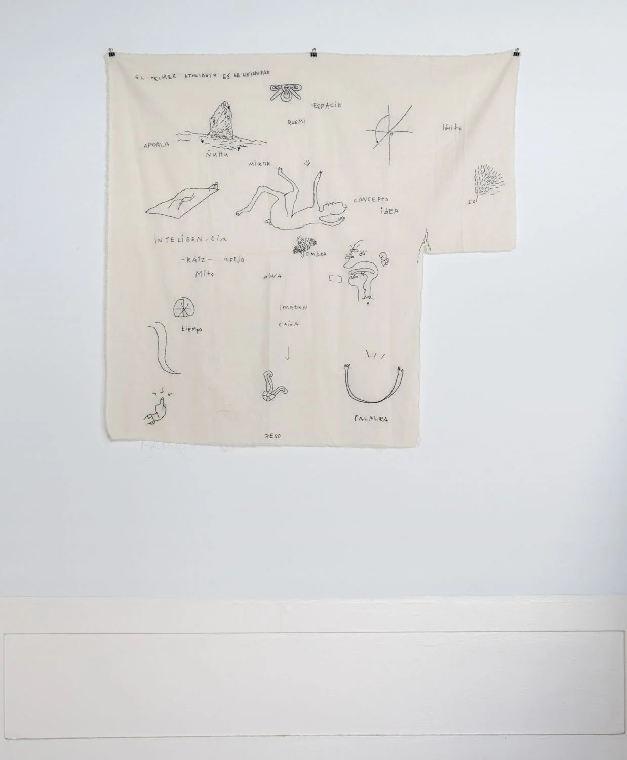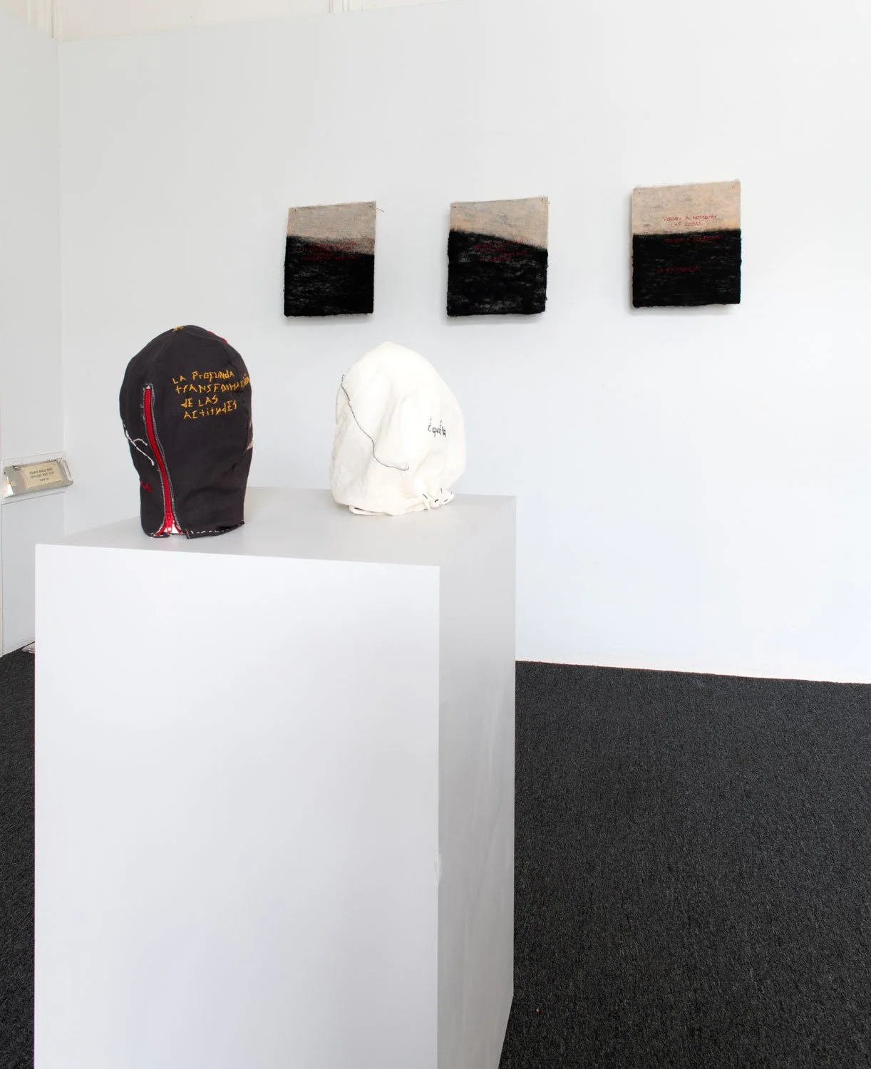 The exhibition also includes a series of face masks, sewn and embroidered with words and symbols that further extend Mortales’ investigation into language and embodiment. Concealing and reshaping the face, the masks operate as sites where language both obscures and reveals. Phrases such as “being two things being confused and ambivalent” and “Volver a nombrar las cosas, volver a comprender la existencia” surface as poetic fragments—gestures toward the instability of meaning and the ongoing act of naming as a way to understand existence.