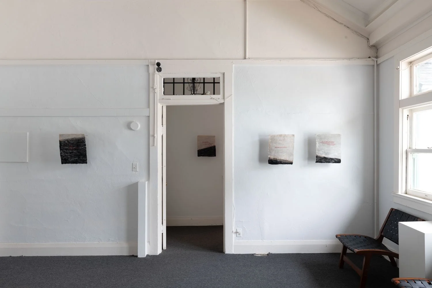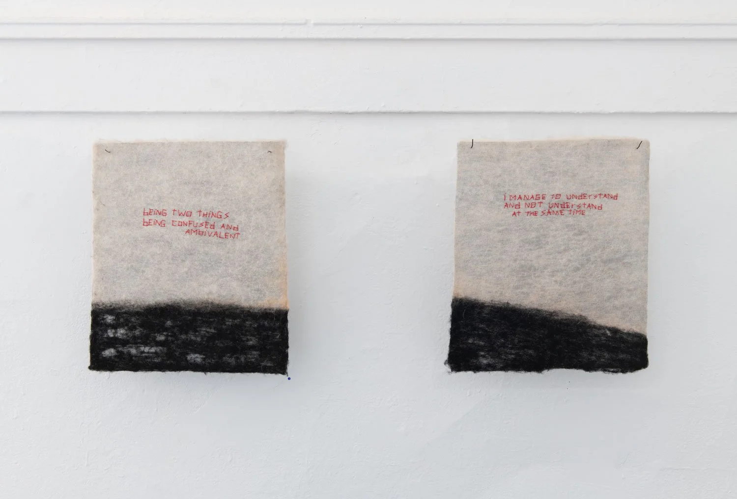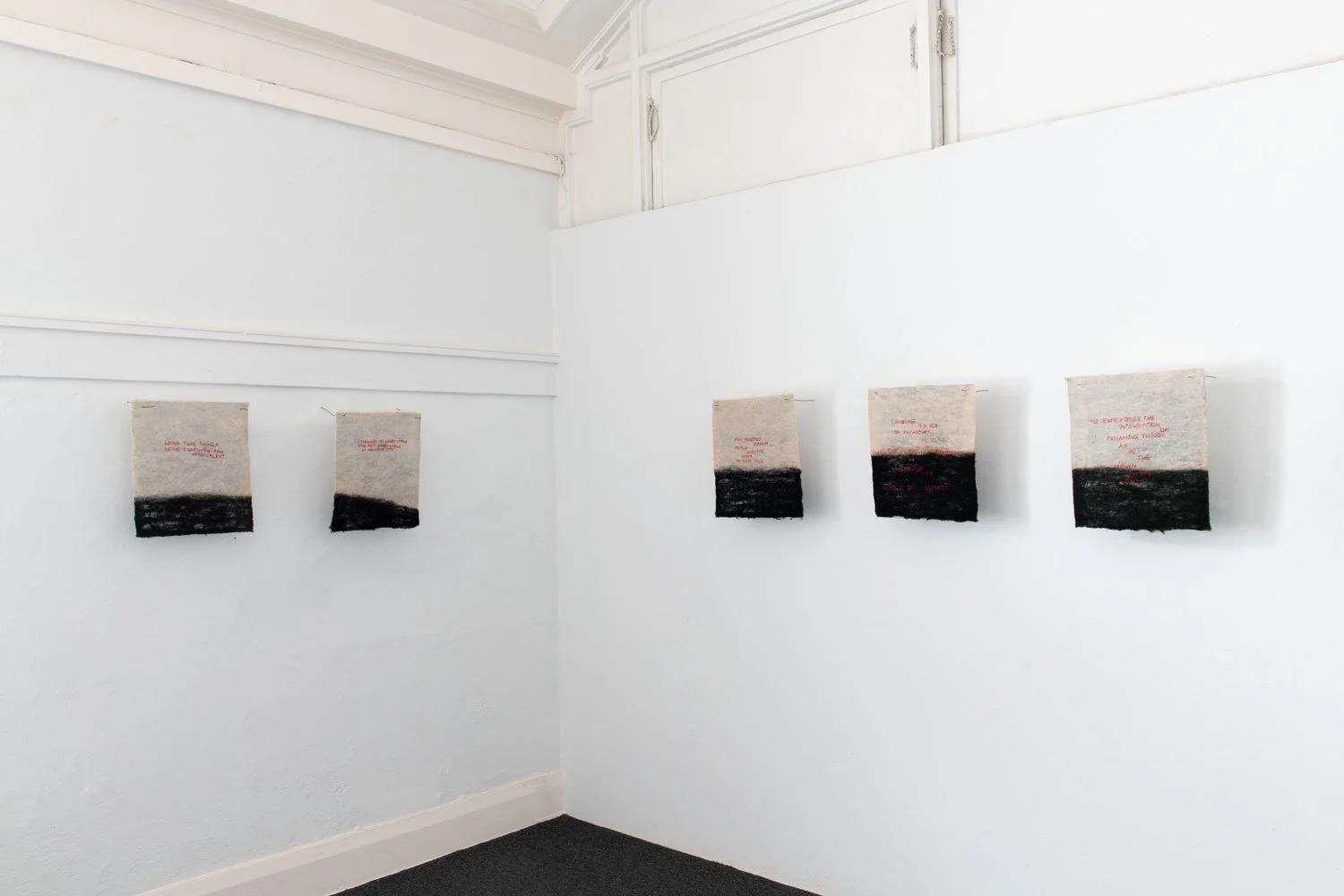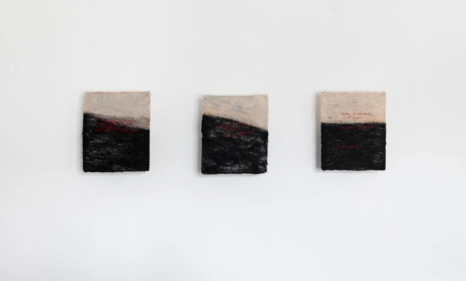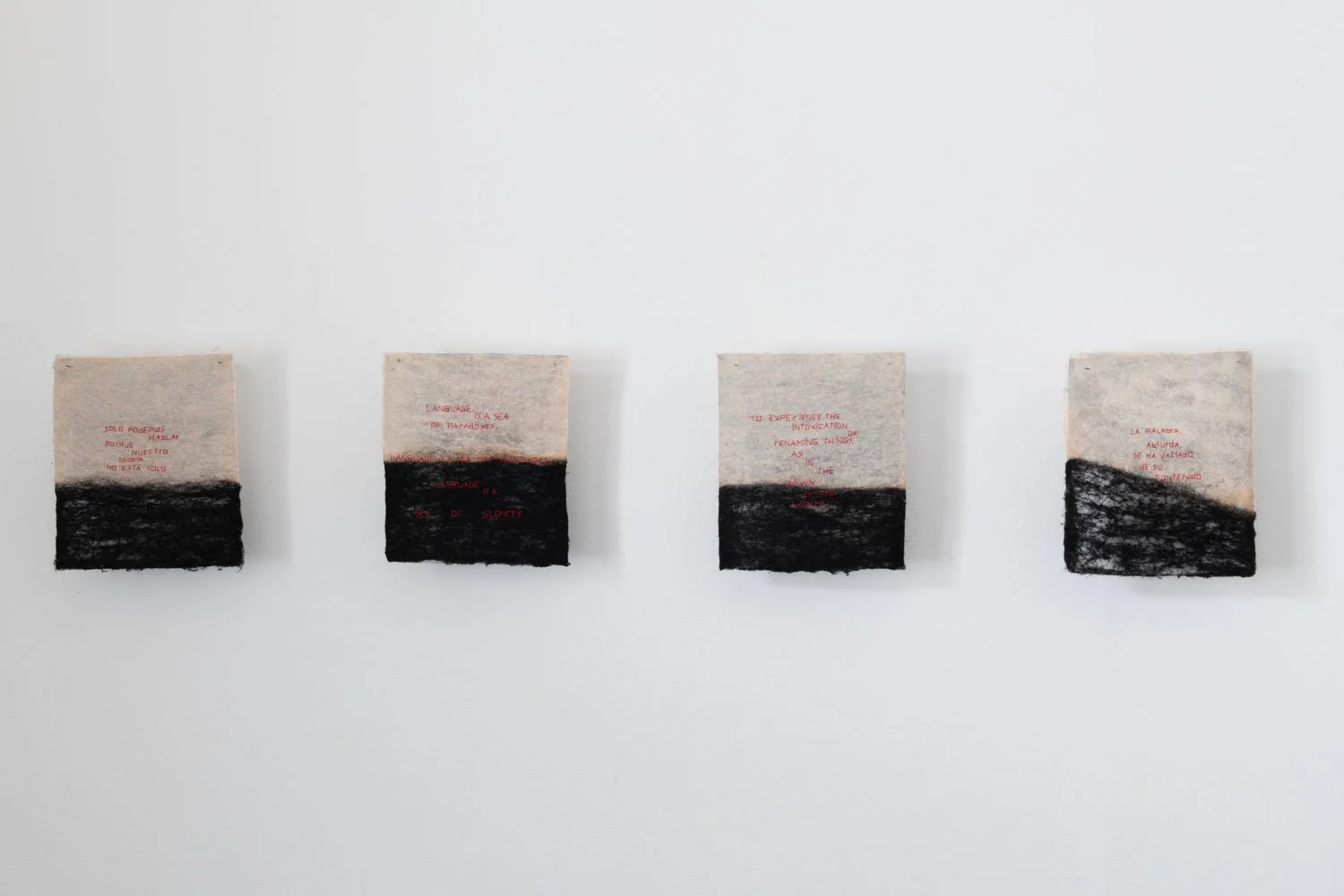 The exhibition’s central series of textile works are uniformly sized at 16 x 14 inches and employ red thread against black and white textile surfaces. While the format remains consistent, the proportion of black within each piece shifts from work to work, suggesting the gradual rise of a tide or the encroaching movement of a sea. This slow visual progression introduces a temporal and spatial rhythm across the series, reinforcing the exhibition’s meditation on language as something that accumulates, advances, and reshapes the terrain it inhabits.