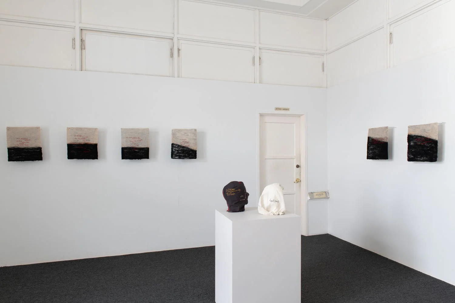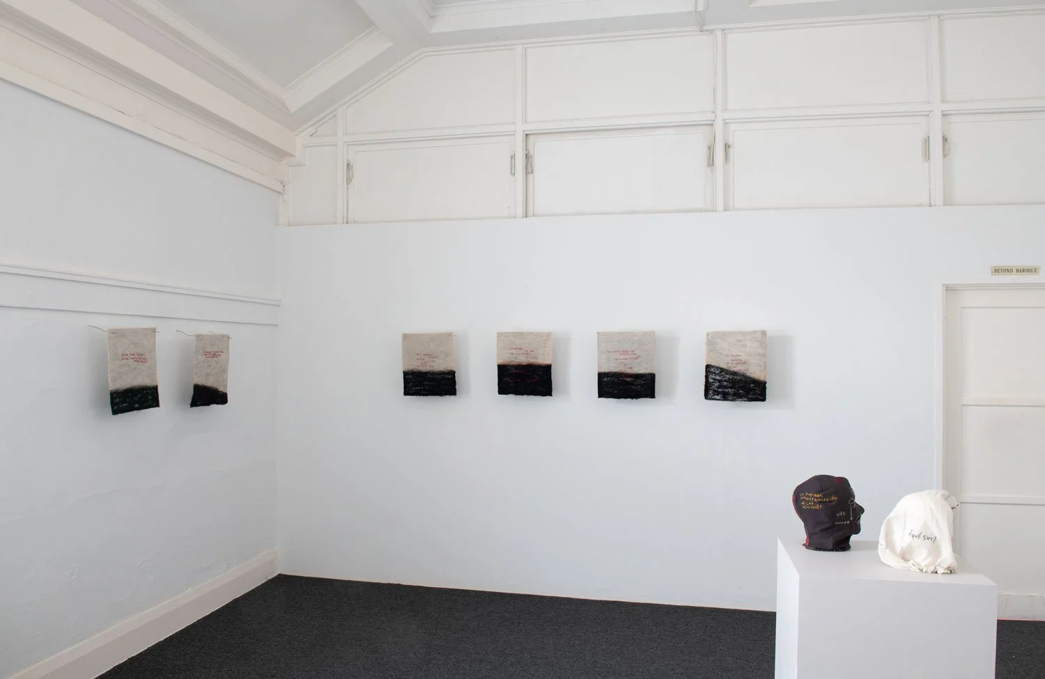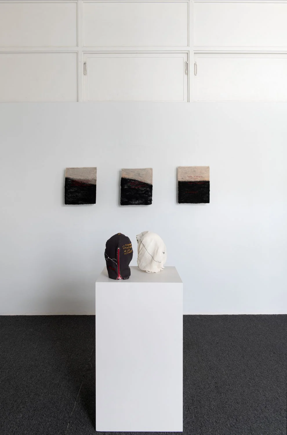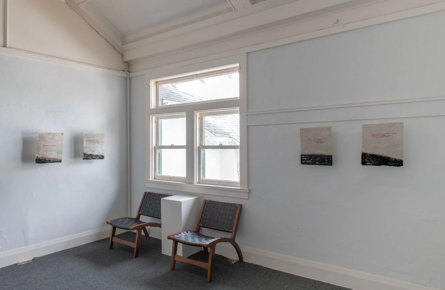 The exhibition’s central series of textile works are uniformly sized at 16 x 14 inches and employ red thread against black and white textile surfaces. While the format remains consistent, the proportion of black within each piece shifts from work to work, suggesting the gradual rise of a tide or the encroaching movement of a sea. This slow visual progression introduces a temporal and spatial rhythm across the series, reinforcing the exhibition’s meditation on language as something that accumulates, advances, and reshapes the terrain it inhabits.