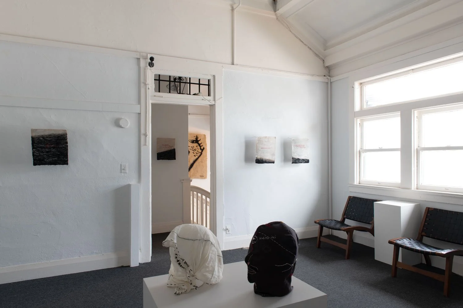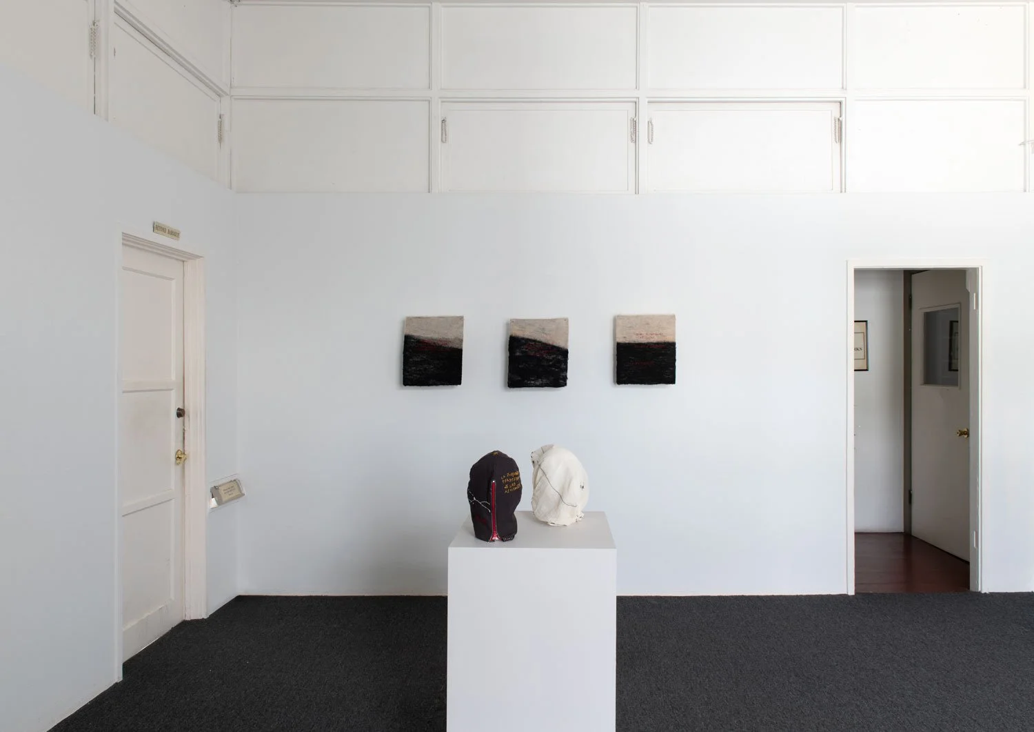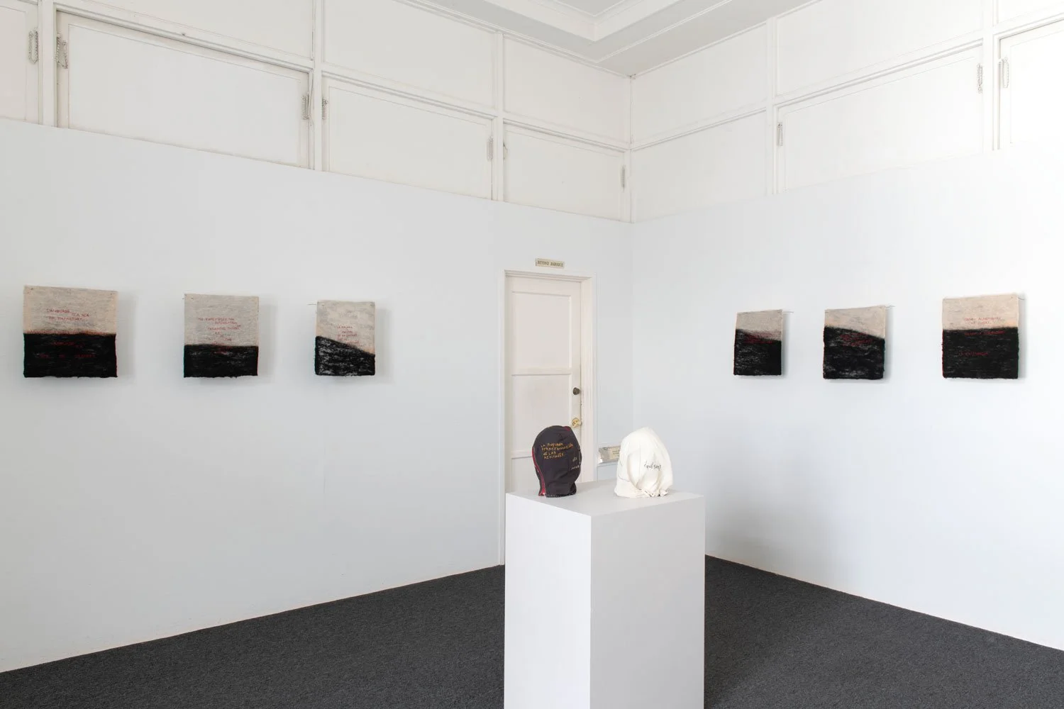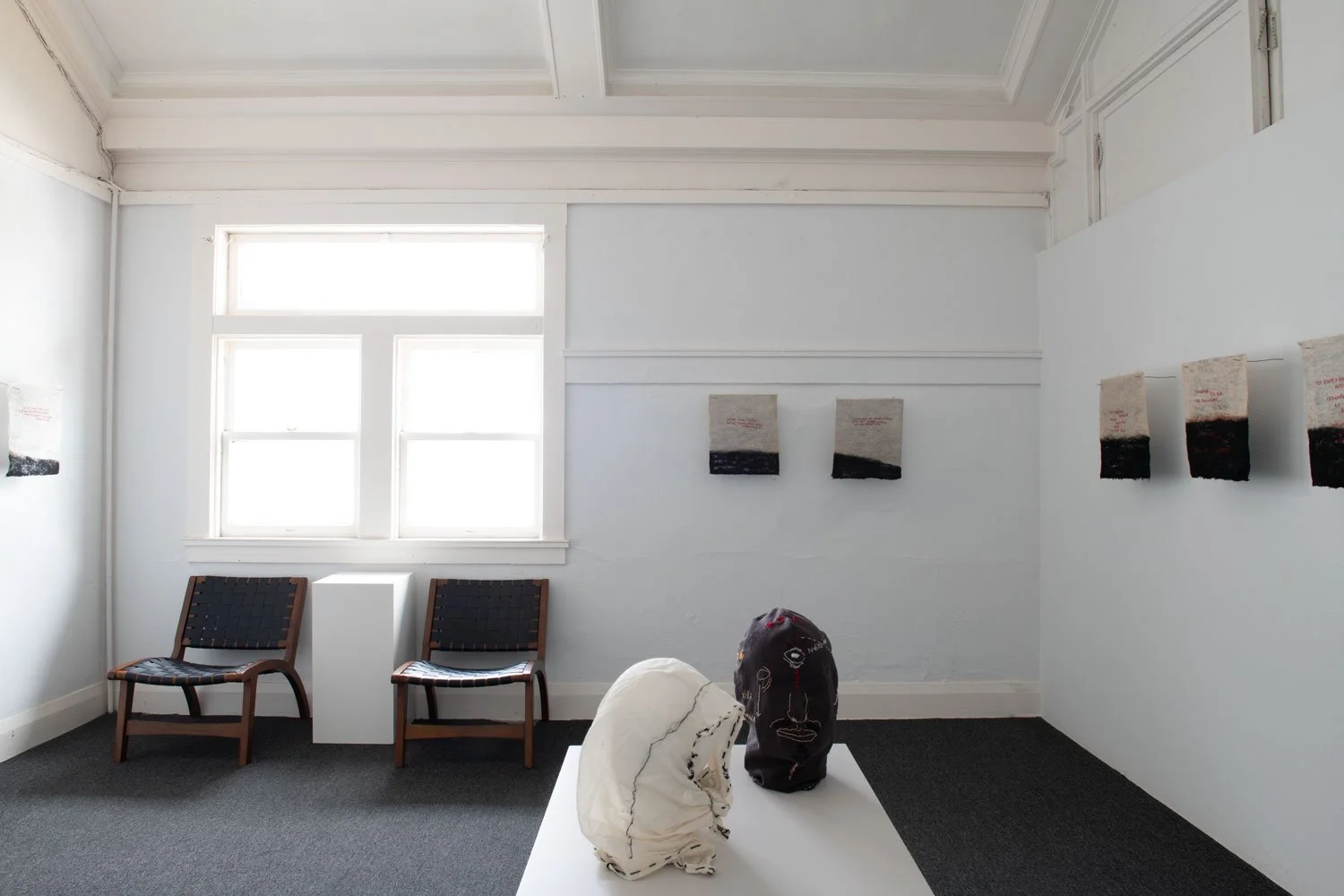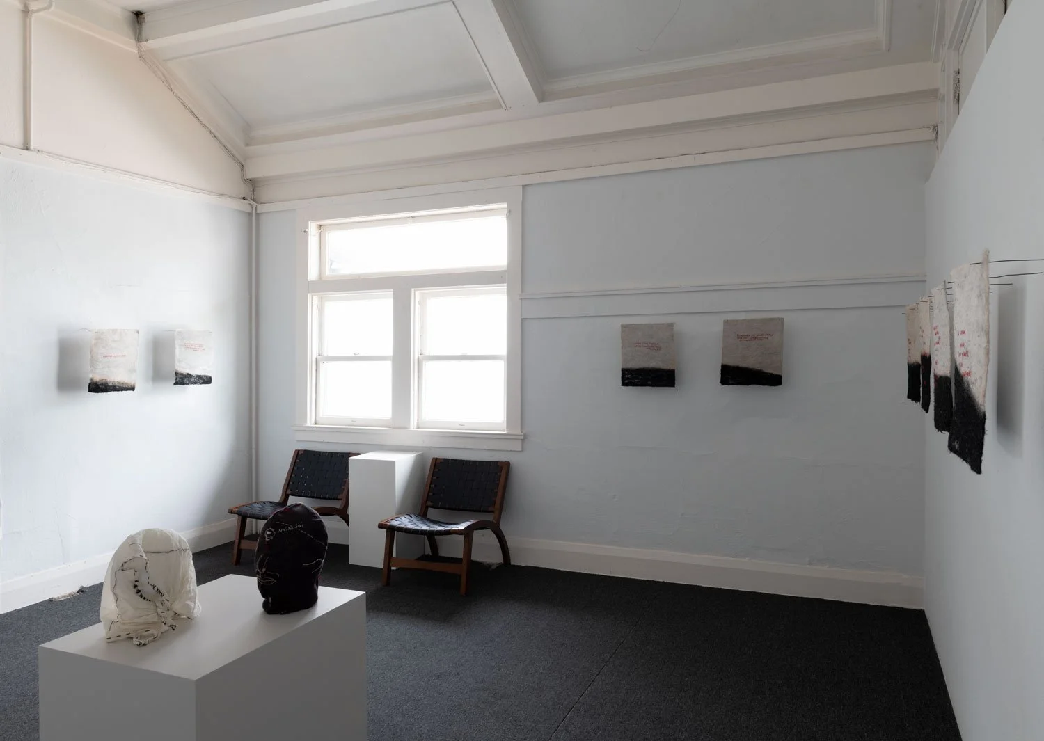 The exhibition’s central series of textile works are uniformly sized at 16 x 14 inches and employ red thread against black and white textile surfaces. While the format remains consistent, the proportion of black within each piece shifts from work to work, suggesting the gradual rise of a tide or the encroaching movement of a sea. This slow visual progression introduces a temporal and spatial rhythm across the series, reinforcing the exhibition’s meditation on language as something that accumulates, advances, and reshapes the terrain it inhabits.