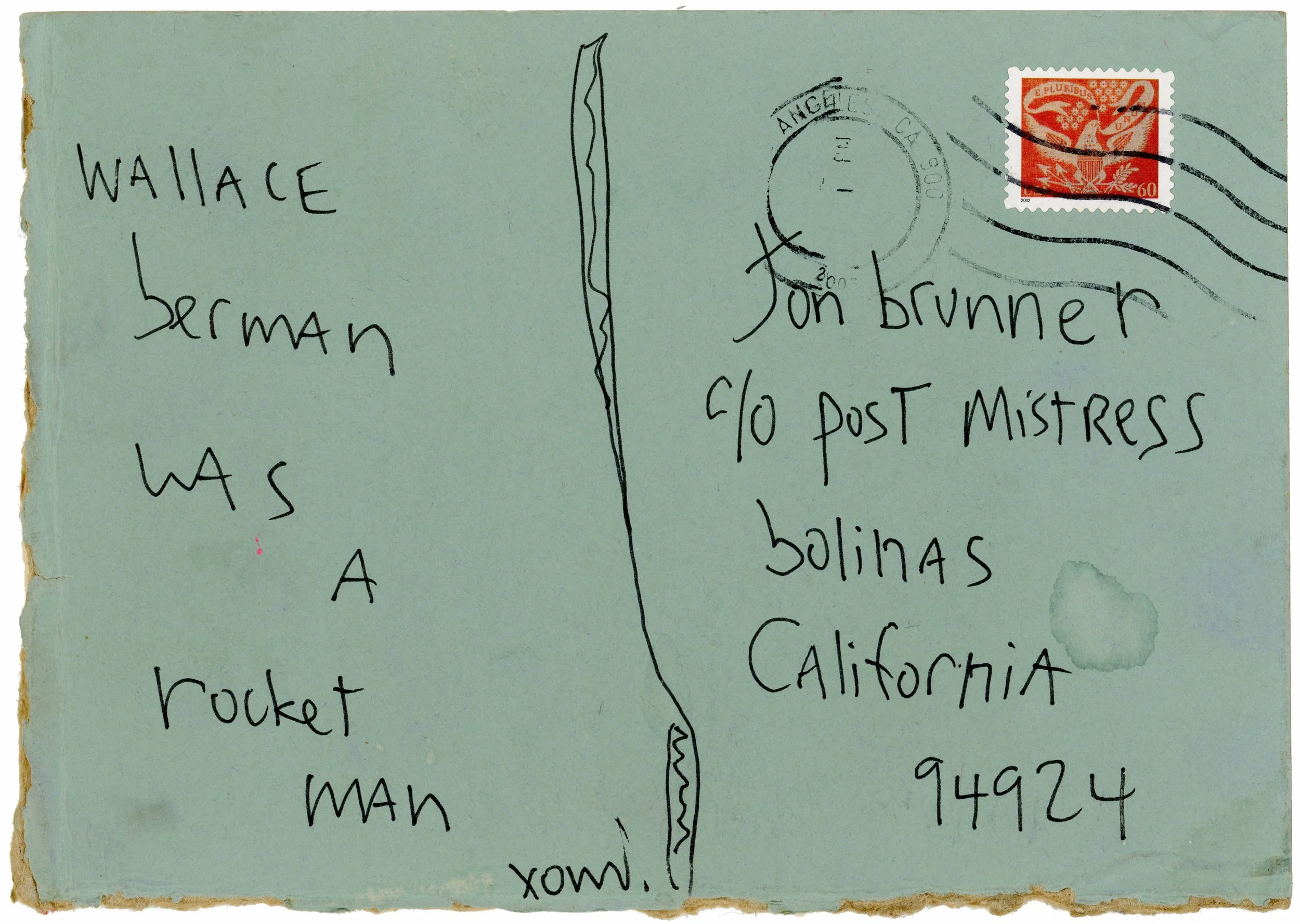Deyermond’s mail art was created in the early 2000s–the majority of it addressed to a dear friend in Bolinas, California, in care of his “Postmistress.” Expressive, hand-painted or linocut words on rough hewn cardboard read “please don’t ever give up on me,” “god I turn me on,” “Suicide now with glory,” alongside typewritten poetic stanzas like, “what would it be like if los angeles had real snow or real stars and the rest of the world had us.” The work radiates the desperation and hope of a poet laying his soul bare on postcards that are not protected by envelopes as they pass through the hands of strangers en route to their intended recipient.