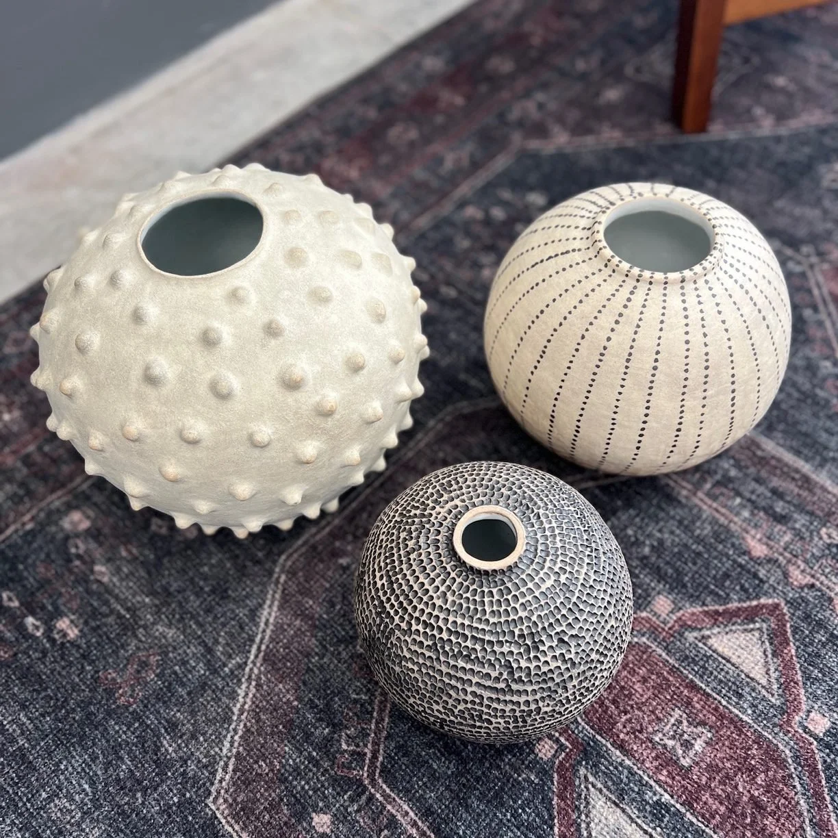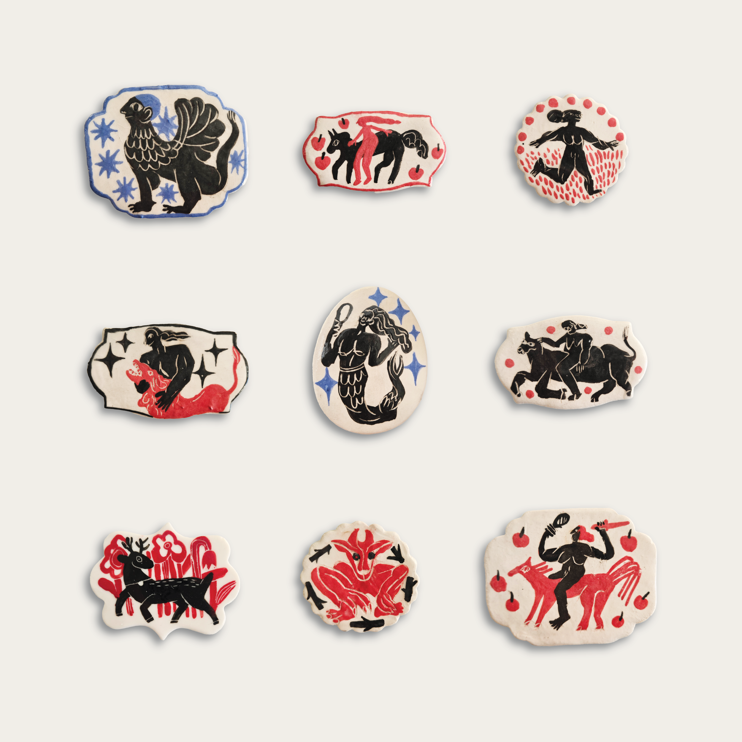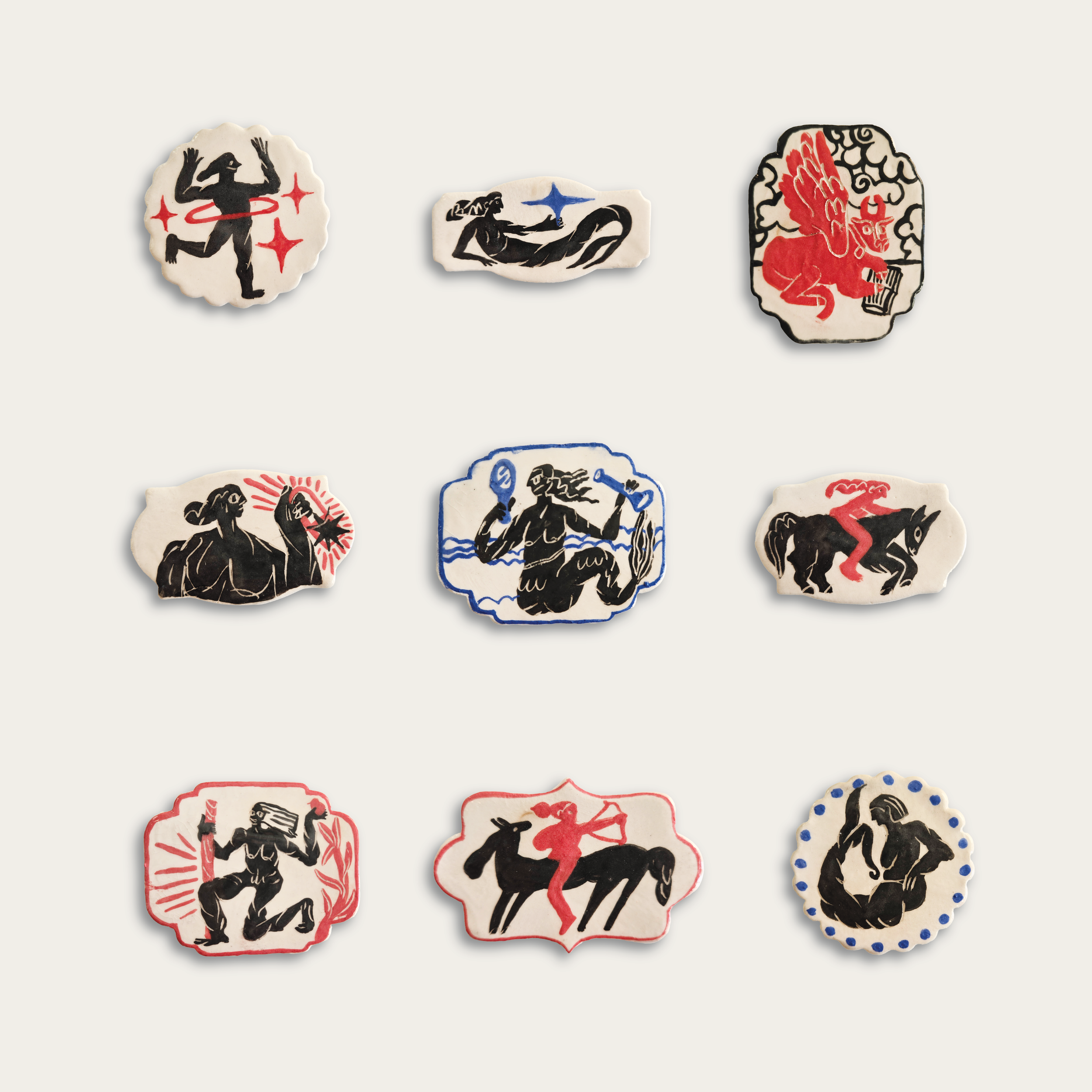 These hand-painted ceramic works by Ukrainian artist Alina Krapachova depict warrior-women, protectors, and mythic fighters. She began creating these figures as her own family faced the realities of war in real time. Each tile is a small act of resilience, capturing strength, defiance, and fierce tenderness.