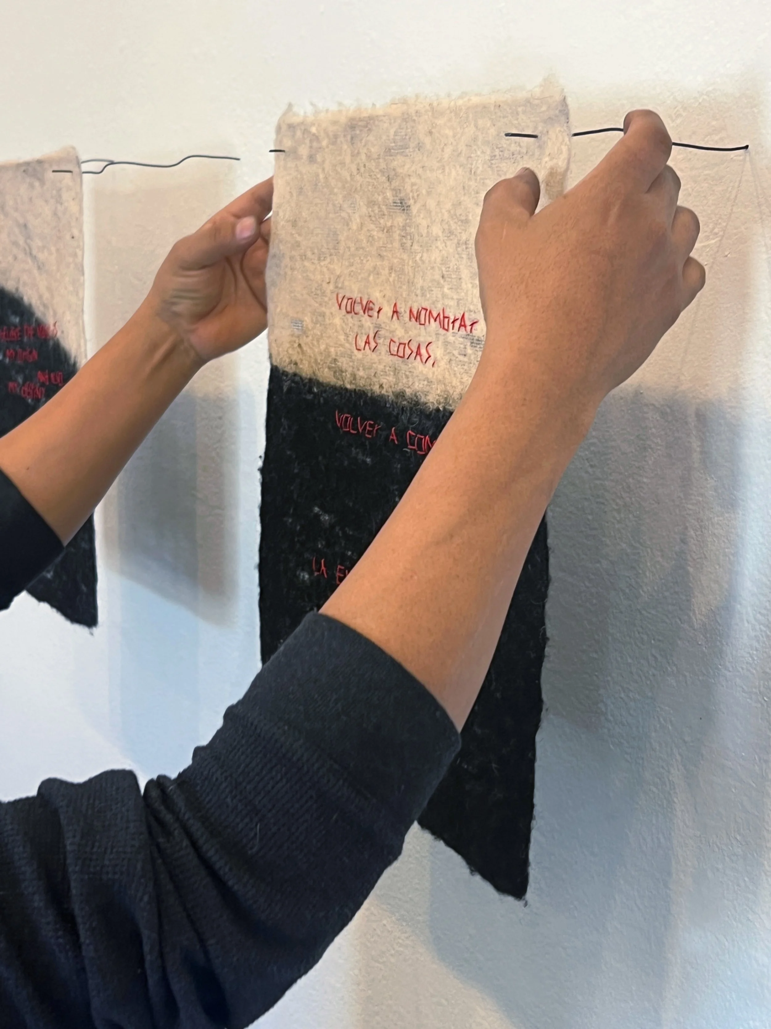 Translating this literary inquiry into material form, Mortales transforms written phrases into tactile works using wool, cotton, and mosquito net. Spanish and English texts become texture; words are reimagined as physical connections, woven into abstract forms that invite close looking and embodied engagement. Rather than illustrating language, the works ask viewers to experience it spatially and sensorially—as something that can be held, traversed, and felt.