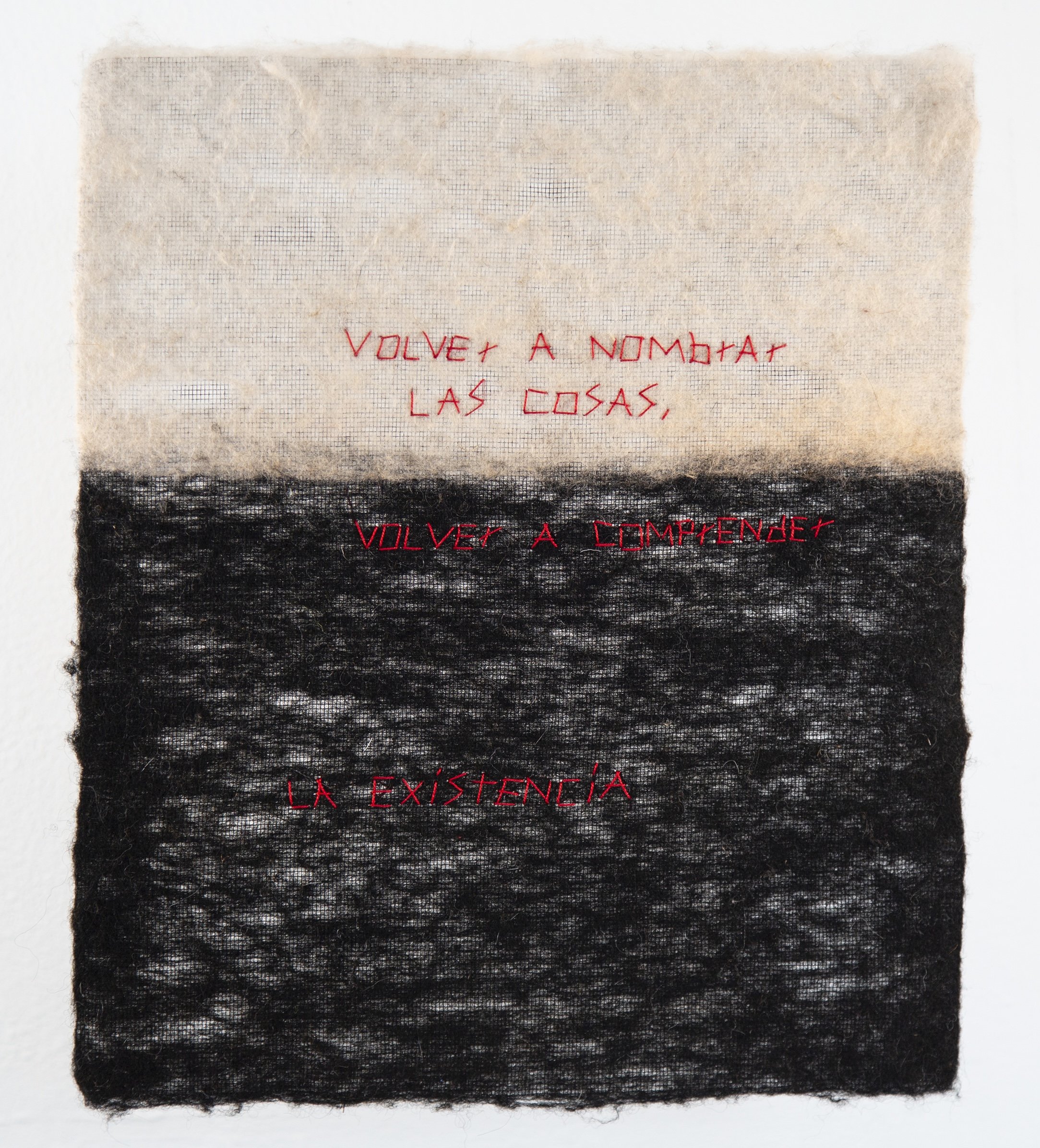 02. Víctor Mortales, Untitled (volver a nombrar), 2025, mosquito net, felting and embroidery, 16 x 14 inches